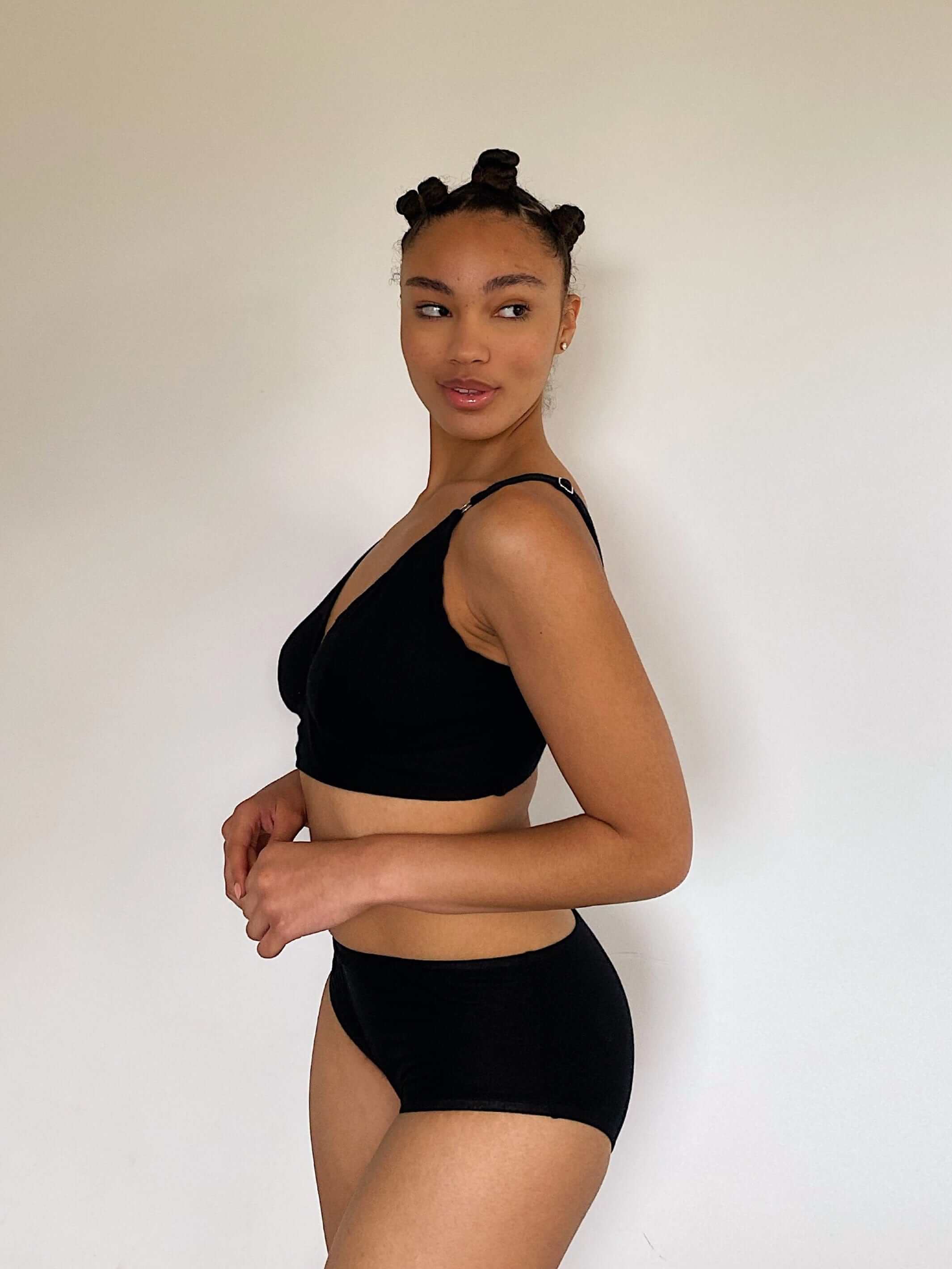 Our black bra is made of Australian knitted and dyed Lenzing fibre Tencel, with tree rubber and organic cotton elastic and custom made organic cotton hooks and eyes. Our sewing thread is Tencel and our labels pad printed in factory using OekoTex dyes.