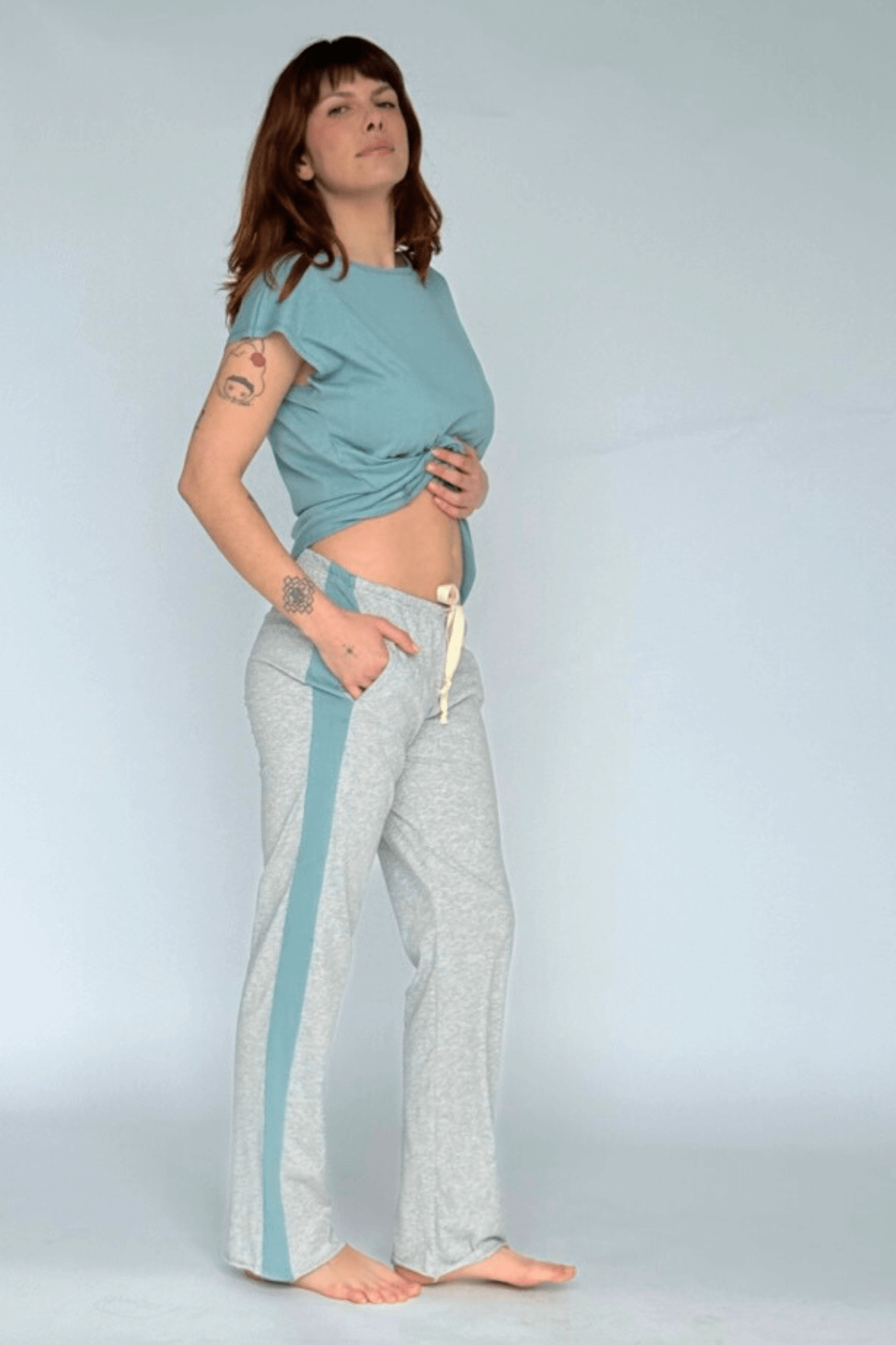 Our super soft, 100% organic cotton loungewear for women made here in Australia. I was busting for a lightweight, soft pair of wide leg lounge pants WITH A STRIPE all through lockdown and I couldn't find any, so now I made my own. The stripe was important to me, I became obsessed. It's not a go-faster stripe, it's a go-slower stripe to suit lockdown life.