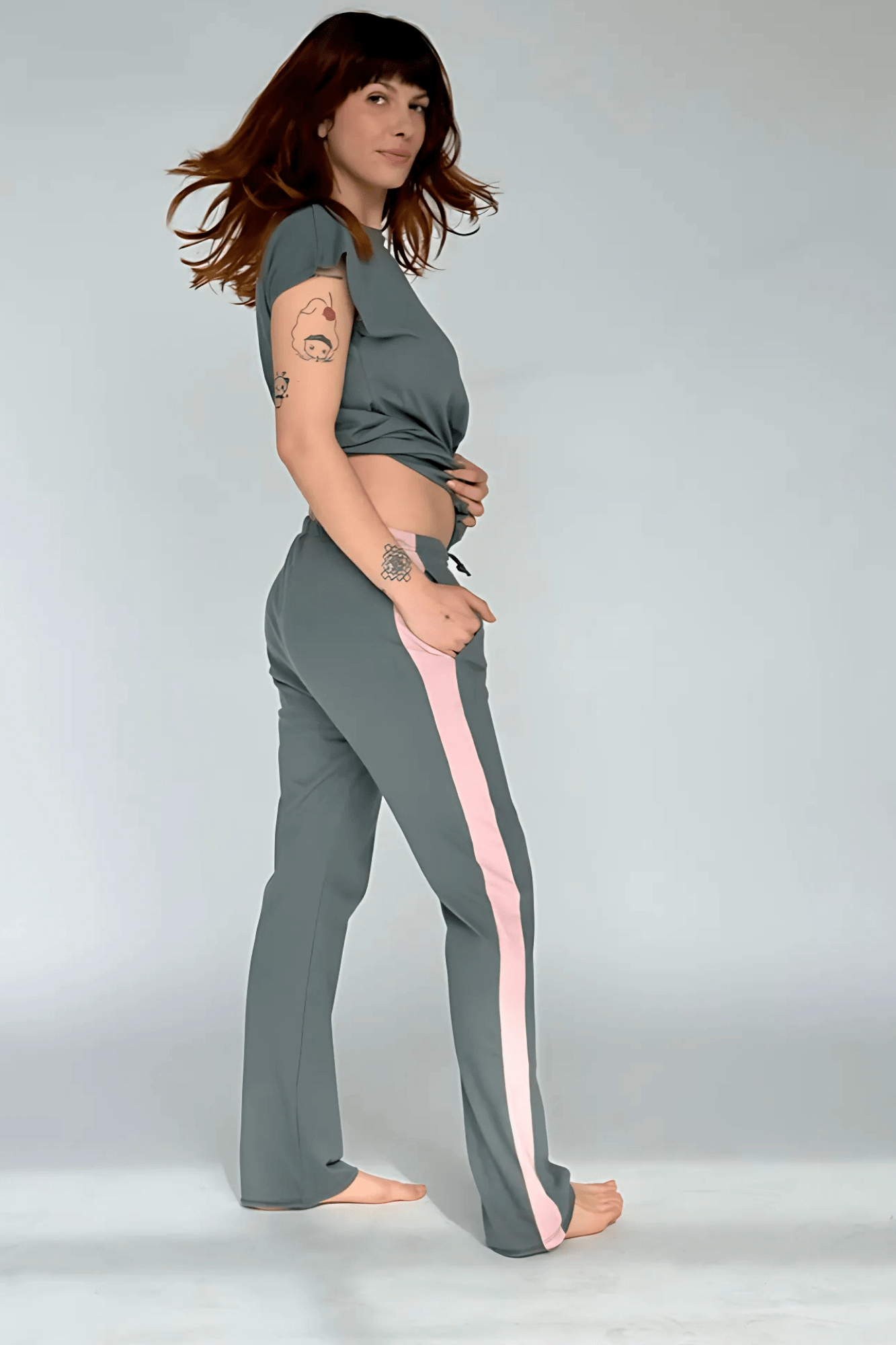 women wearing grey womens organic cotton t shirt and womens long cotton pants
