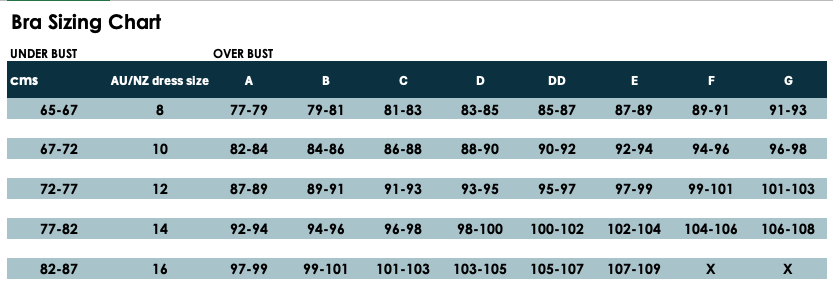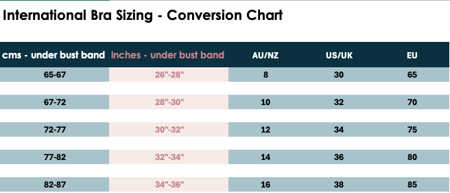 We recommend you start with the size that you wear and fits you comfortably now, but if this is your first Very Good Bra it's well worth measuring and checking against the below.