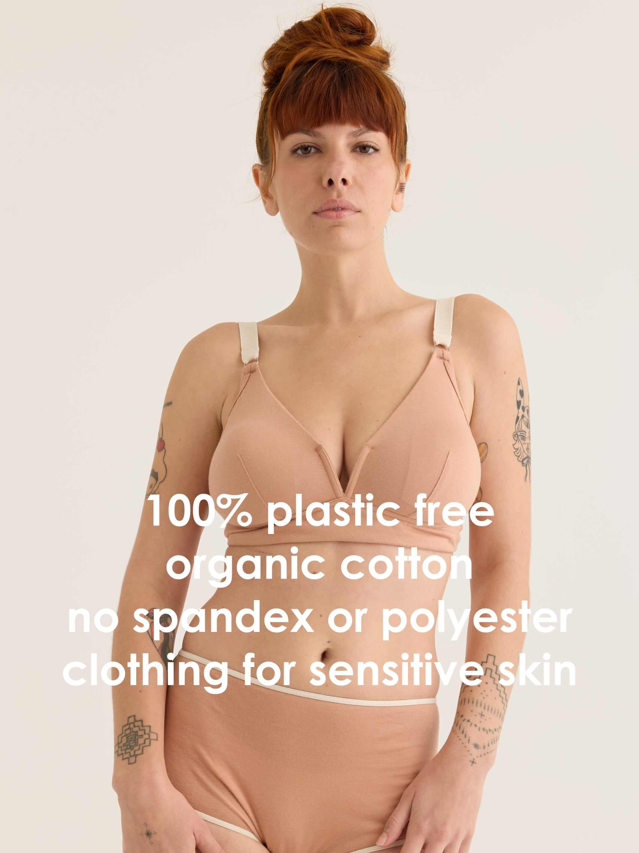 Our organic cotton bras in a range of colours are made from organic cotton knitted and GOTs dyed here in Australia.